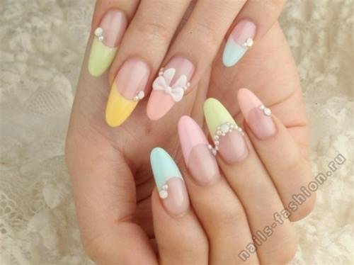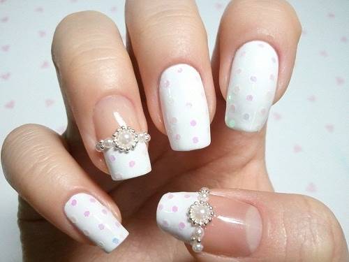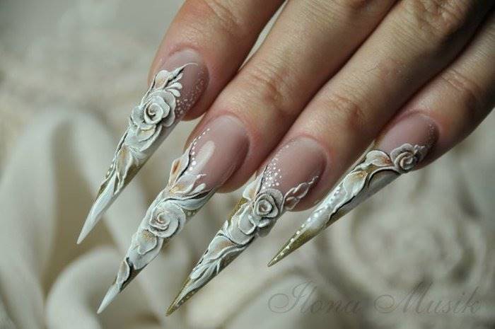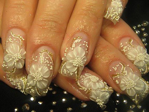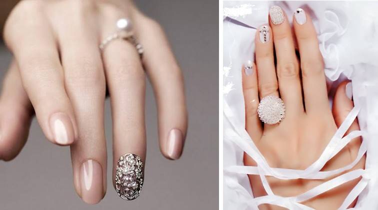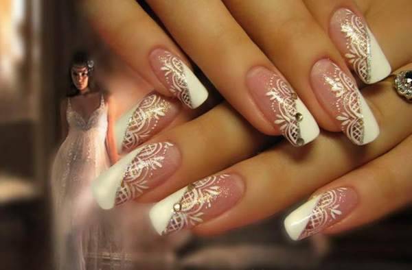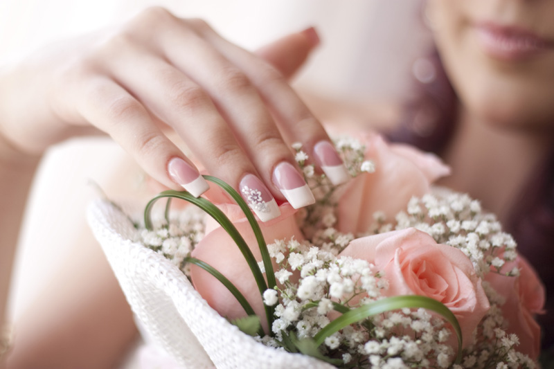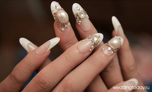 На свадьбе, обручальное колечко и ваши руки будут постоянно в центре внимания, а сколько будет сделано фотографий! Уделите время созданию праздничного маникюра. Если вы облаете навыками, то можете сделать его самостоятельно, но все – таки праздничный вид ногтей, лучше делать у специалиста. Каким бы ни был свадебный маникюр, важно чтобы он сочетался с общим образом невесты. Маникюр может быть аппаратным, классическим обрезным, японским (при этом проводится процедура оздоровления ногтей), американский (сочные цвета), вам могут сделать пирсинг на ногти и многое другое. SPA обработка ваших пальцев, позволит привести руки в идеальное состояние, даст возможность отдохнуть и расслабиться. Пирсинг, в настоящее время, не так популярен, но золотые или бриллиантовые камушки внутри проколотых ногтей смотрятся элегантно и в то же время экстравагантно.