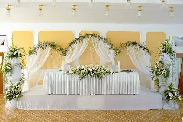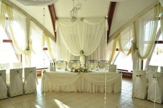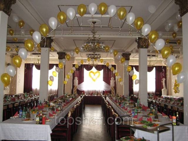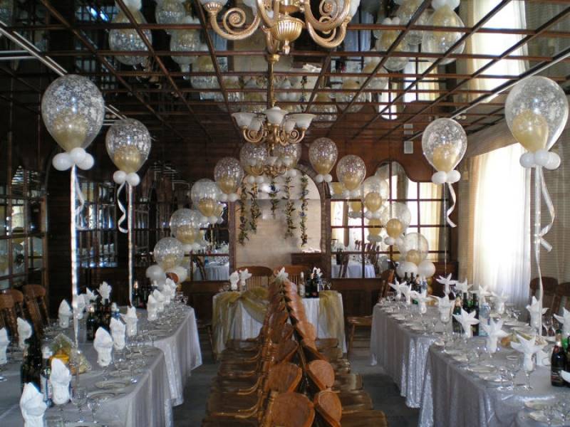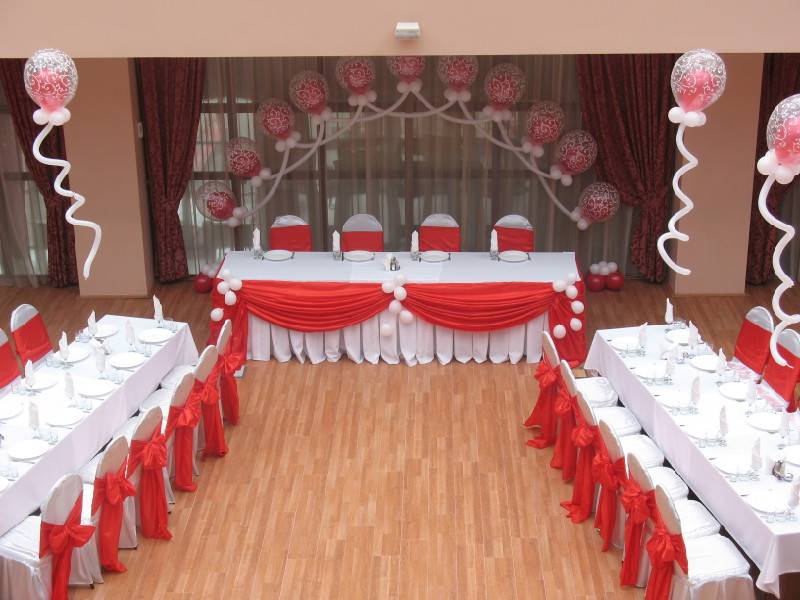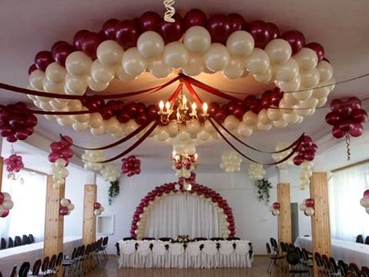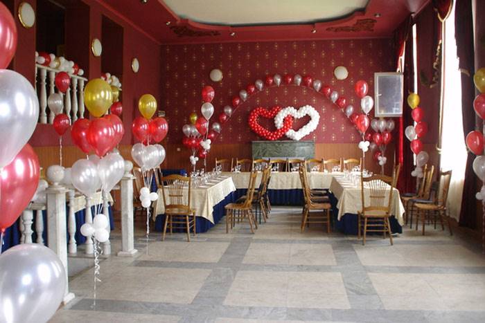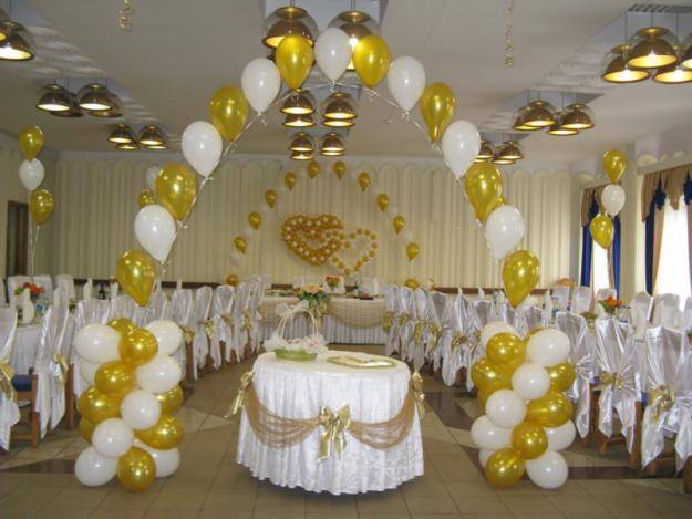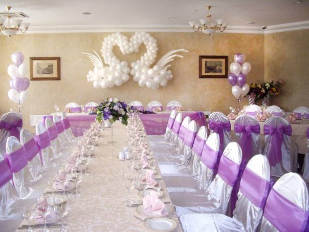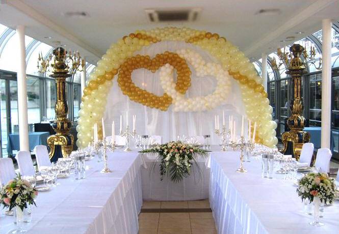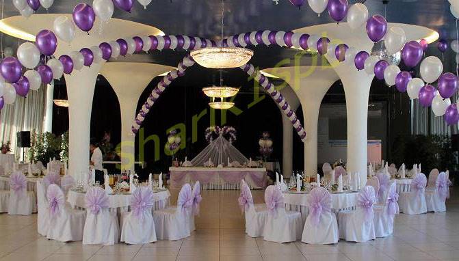 Оформление свадебного зала цветами Цветы – удобный материал для украшения помещения. С помощью цветочных украшений легко избавится от недостатков и неправильных пропорций. В качестве украшения подойдут живые цветы, композиции из осенних листьев и веток. Украшение живыми цветами недешевое оформление. Заранее обговорите с флористом, где будет проводиться свадебное торжество, он должен оценить освещение, расстановку мебели, стилистику свадьбы и цвет платья невесты. Те, кто решил оформить зал цветами самостоятельно, следует посетить курсы флористов. Так как необходимо знать технику составления букетов, гирлянд, сочетание цветов и многое другое. Оформление свадебного зала тканями Использование тканей в оформлении зала, так же дорогой вариант, но изысканность и праздничное настроение гарантированно. Важно подобрать оптимальную плотность ткани и ее цвет. Яркие ткани подарят заряд бодрости, а пастельные оттенки создадут атмосферу романтики. Не экономьте на качестве ткани, декор сложная работа, требующая навыков и чувства вкуса. Ознакомьтесь с рекомендациями специалистов в области крепежа и драпировки ткани. Нарисуйте эскиз и подготовьте все необходимое для работы. Помните о том, что украшать нужно все помещение: столы, окна, арки, колонны, стены и так далее. Декор зала тканями хорошо сочетается с украшением шарами и цветами. Оформление свадебного зала шарами Воздушные шары самый доступный вариант оформления зала. Ими можно украсить как скромную, так и шикарную свадьбу. Воздушным шарам придают форму гирлянды, украшают стразами, лентами, цветами, упаковочной бумагой. Надутые шары скрепляют без ниток, хвостиками. Разноцветную гирлянду получают с помощью шаров различного размера, следите за тем, чтобы цвета гармонировали друг с другом. Придать гирлянде форму можно закрепив ее на стене или с помощью шариков, в которые будет набрана вода. Опубликовано 27-05-2013, 21:31 Комментарии