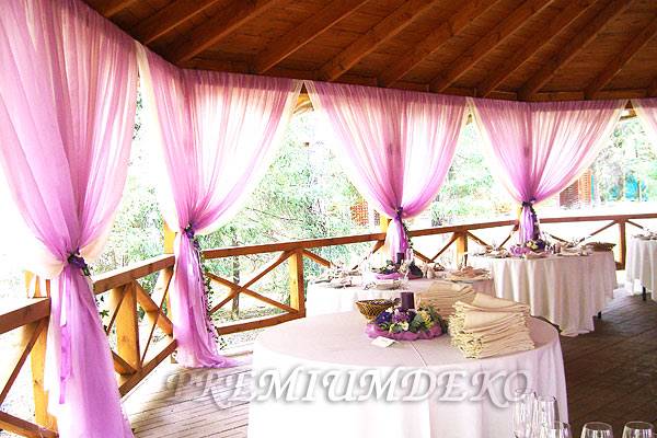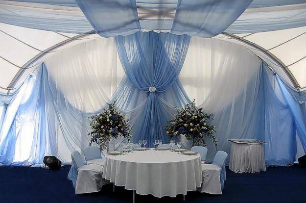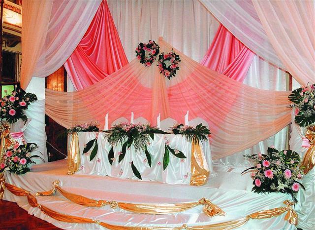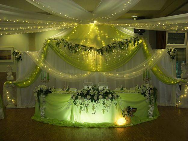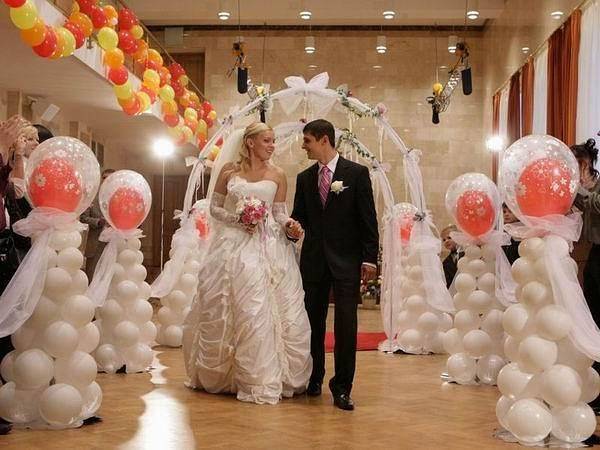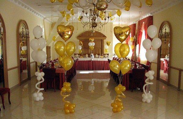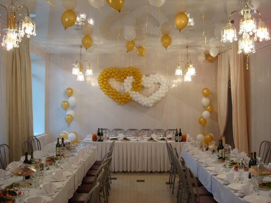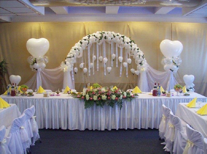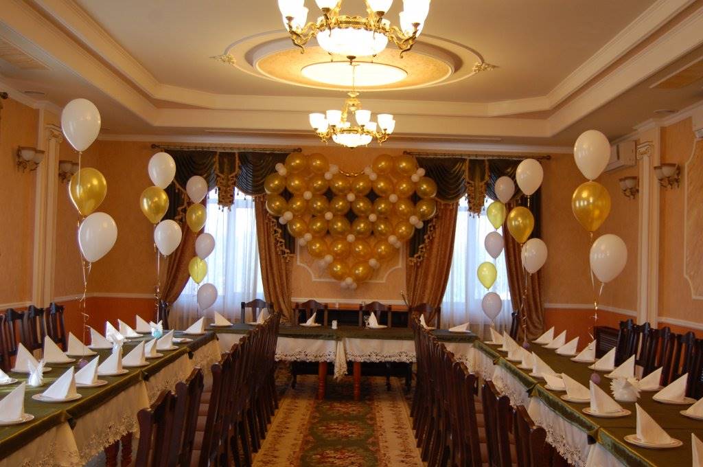 Оформление свадебного зала цветами Цветы – удобный материал для украшения помещения. С помощью цветочных украшений легко избавится от недостатков и неправильных пропорций. В качестве украшения подойдут живые цветы, композиции из осенних листьев и веток. Украшение живыми цветами недешевое оформление. Заранее обговорите с флористом, где будет проводиться свадебное торжество, он должен оценить освещение, расстановку мебели, стилистику свадьбы и цвет платья невесты. Те, кто решил оформить зал цветами самостоятельно, следует посетить курсы флористов. Так как необходимо знать технику составления букетов, гирлянд, сочетание цветов и многое другое. Оформление свадебного зала тканями Использование тканей в оформлении зала, так же дорогой вариант, но изысканность и праздничное настроение гарантированно. Важно подобрать оптимальную плотность ткани и ее цвет. Яркие ткани подарят заряд бодрости, а пастельные оттенки создадут атмосферу романтики. Не экономьте на качестве ткани, декор сложная работа, требующая навыков и чувства вкуса. Ознакомьтесь с рекомендациями специалистов в области крепежа и драпировки ткани. Нарисуйте эскиз и подготовьте все необходимое для работы. Помните о том, что украшать нужно все помещение: столы, окна, арки, колонны, стены и так далее. Декор зала тканями хорошо сочетается с украшением шарами и цветами. Оформление свадебного зала шарами Воздушные шары самый доступный вариант оформления зала. Ими можно украсить как скромную, так и шикарную свадьбу. Воздушным шарам придают форму гирлянды, украшают стразами, лентами, цветами, упаковочной бумагой. Надутые шары скрепляют без ниток, хвостиками. Разноцветную гирлянду получают с помощью шаров различного размера, следите за тем, чтобы цвета гармонировали друг с другом. Придать гирлянде форму можно закрепив ее на стене или с помощью шариков, в которые будет набрана вода. Опубликовано 27-05-2013, 21:31 Комментарии