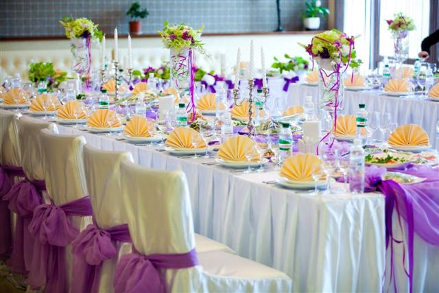Оформление свадебного зала Категория: Оформление и декор Праздничная и приятная обстановка во многом зависит от оформления зала, неважно кафе это, столовая или веранда загородного дома. Как правило, зал украшают родственники невесты и ее подружки. Можно пригласить дизайнера, а можно все сделать самостоятельно. Свадьбу в русском народном стиле украсят красочные платки, засушенные цветы, деревянная утварь, ковер и самовар. Европейская свадьба предполагает обилие цветов, драпировку тканями и воздушные шары. Помещение для костюмированной свадьбы в стиле 19 века отличают большие зеркала, лепнина, огромные люстры ,кресла с высокими спинками и отдельный зал для танцев. Свадьба по собственному сценарию настоящий простор для фантазии. На стенах расположите плакаты с пожеланиями и поздравлениями, цветные фонарики, гирлянды из цветов, лент или листьев. Все столы должны быть накрыты одинаковыми скатертями. Столы украшают лентами, цветочными композициями и свечами.