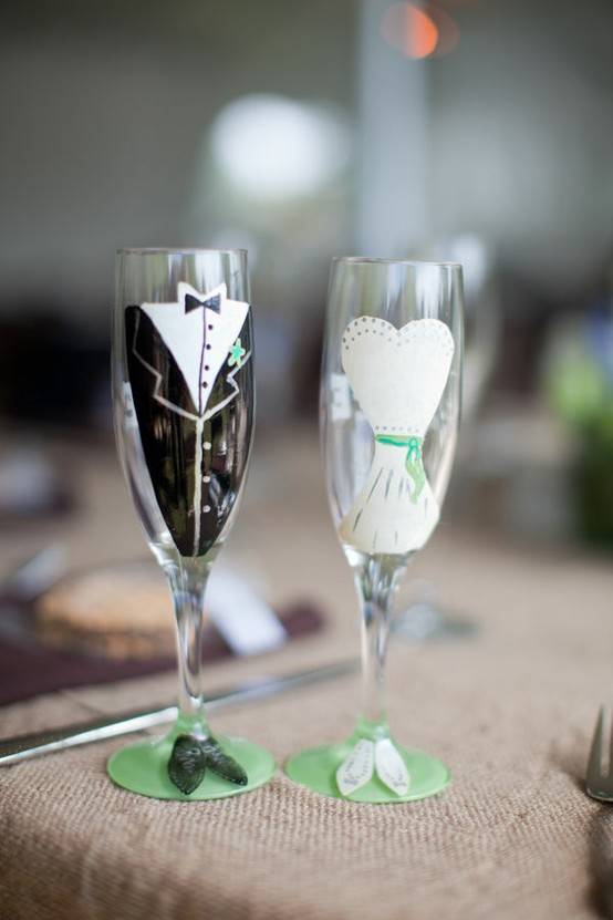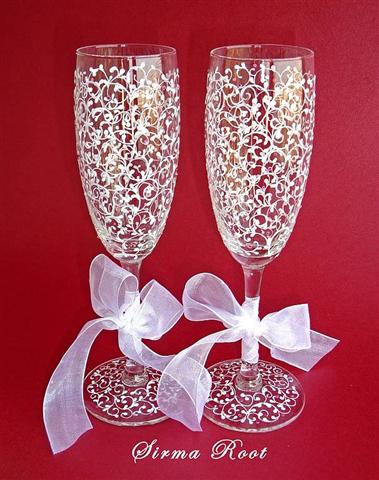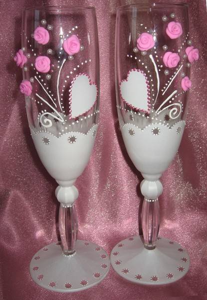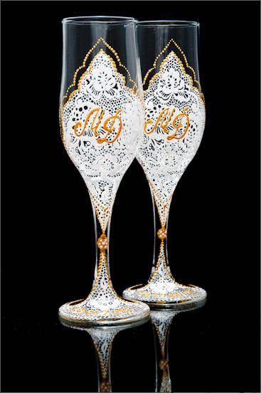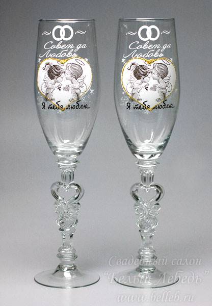 Оформление свадебных бокалов Категория: Оформление и декор Бокалы для молодоженов особый свадебный аксессуар, который расписывают, а впоследствии разбивают. Эта традиция является частью свадьбы, поэтому бокалы обязательно должны быть необычными. Традиция разбивать на свадьбе бокалы пришла к нам из далекого прошлого. У разных народов свои варианты, но смысл везде одинаков – бить посуду к счастью. Считается, что звон стекла способен отогнать злых духов, а звон хрусталя вообще наделен магическими свойствами. Обычно, бокалы бьют после того, как новобрачных объявили мужем и женой. Осколки - это символ счастливой жизни, чем их больше, тем дольше проживет пара. Бокалы не разбились? Не стоит расстраиваться, свидетель ногой разбивает посуду и веселье продолжается.