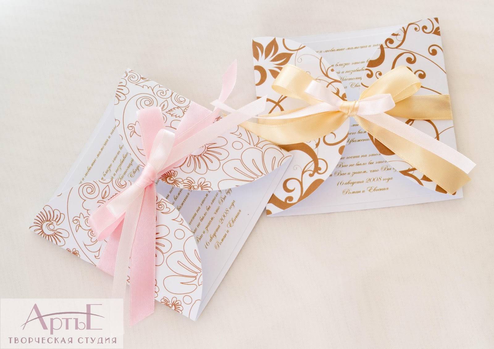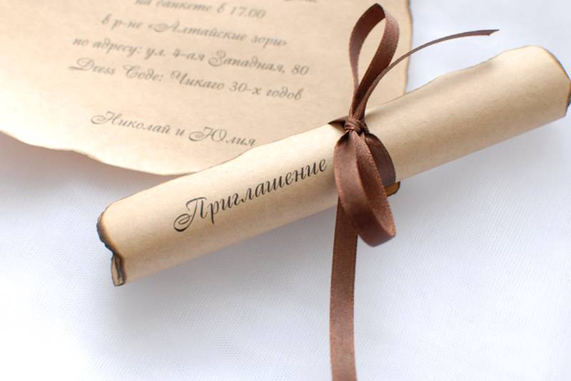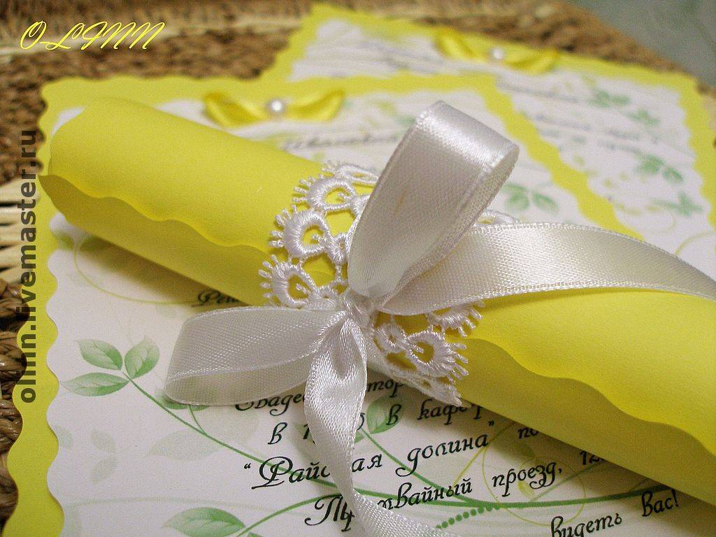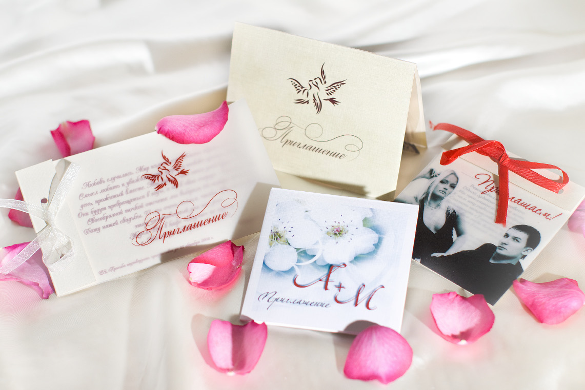 заказать пригласительные ручной работы у мастера и вам создадут уникальный шедевр из бумаги, дорогой кожи, красивой ткани и тому подобное. свадебной открытки может быть лукошком с сюрпризом, старинным папирусом, бутылкой с запиской, ценной бандеролью или экзотическим фруктом. Заказать или приобрести готовые пригласительные открытки можно тут