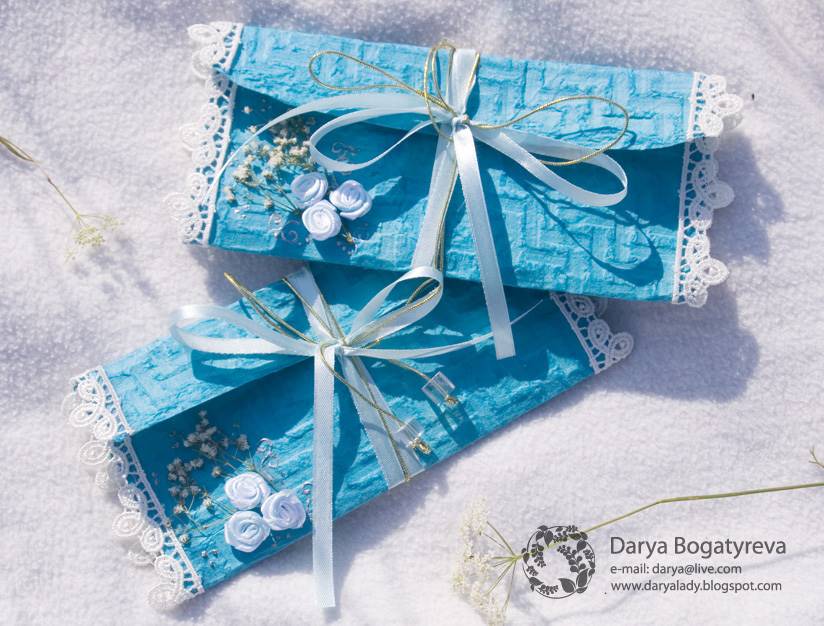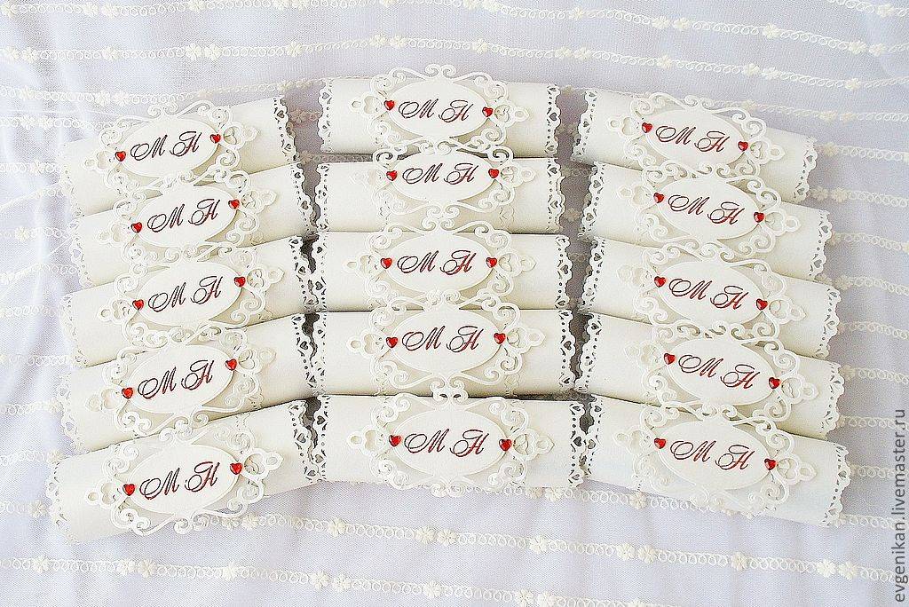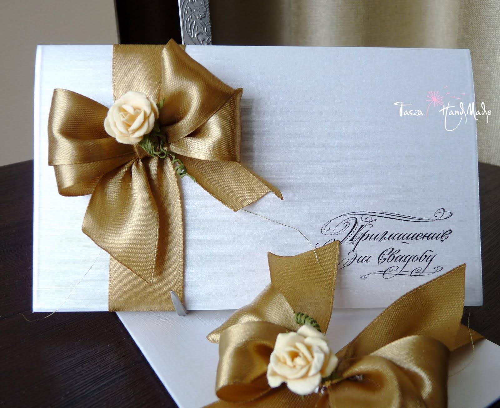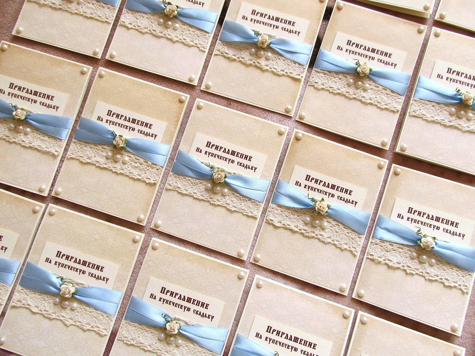 заказать пригласительные ручной работы у мастера и вам создадут уникальный шедевр из бумаги, дорогой кожи, красивой ткани и тому подобное. свадебной открытки может быть лукошком с сюрпризом, старинным папирусом, бутылкой с запиской, ценной бандеролью или экзотическим фруктом. Заказать или приобрести готовые пригласительные открытки можно тут