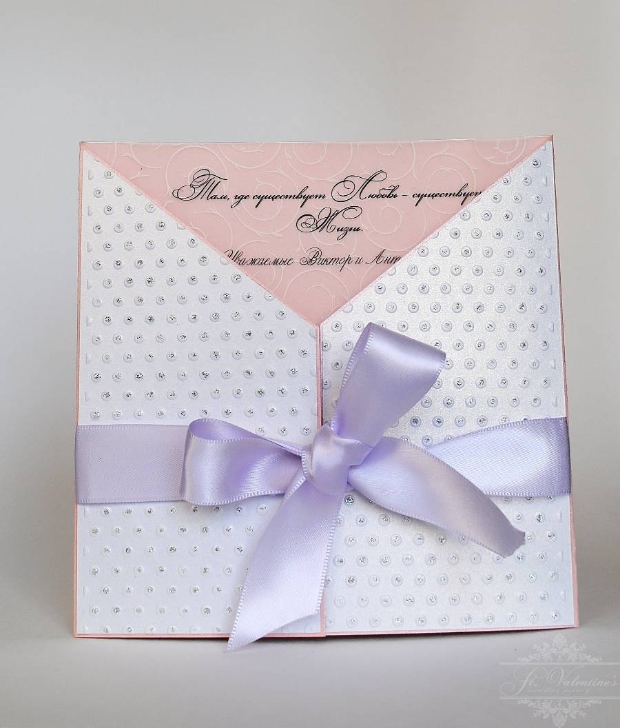 Советы молодоженам: 1. Определите число гостей приглашенных на свадьбу, займитесь составлением списка с именами, адресами и номерами телефонов. Все чаще молодожены предпочитают создать приглашение самостоятельно. Для этого нужна плотная бумага, лекало, бисер, пайетки, ленты, цветная бумага. Текст для свадебных пригласительных может быть дружеским или официальным. Рассылают приглашение за два месяца до предполагаемого события. В тексте необходимо упомянуть дату свадьбы, имена молодоженов, время и адрес проведения церемонии. Обязательно укажите, будет ли венчание, гостям необходимо подготовиться к посещению храма. 2. Не забудьте в конвертик с приглашением вложить чистый конверт, так как возможно вам захотят написать ответ. Приглашение семье выглядит как перечисление всех ее членов по именам. Если ребенок в приглашении не указан, то его на свадьбе не ожидают. Лучше не приглашать бывших супругов, тех, кто неприятен молодоженам и тех, кто много пьет. Для детей на свадьбе предусмотрите специальное развлечение, так как они будут мешать родителям, наслаждаться вечером. Приглашение на бракосочетание и на торжество – это две отдельных открытки. Либо вместе с приглашением вложите листок с указанием места и времени, где проводится банкет. 3. Своими руками приглашение можно создать с помощью различных техник. Одно из направлений рукоделия – скрапбукинг, в специализированных отделах или в интернет магазине, вы найдете все необходимое для подобного рода деятельности. Техника – квиллинг подразумевает создание различных фигур из закрученных полосок бумаги. Популярна техника айрис – фолдинг. Приглашение создают из двух слоев, эффектна бумага, слой за слоем наклеенная полосками. Опубликовано 16-07-2013, 15:35 Комментарии