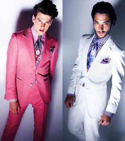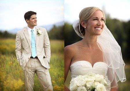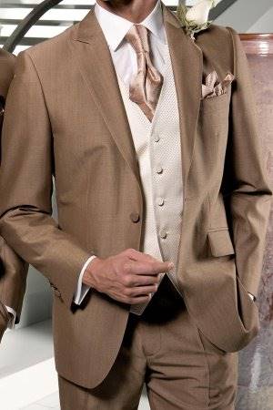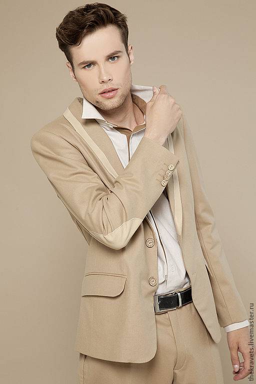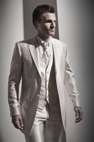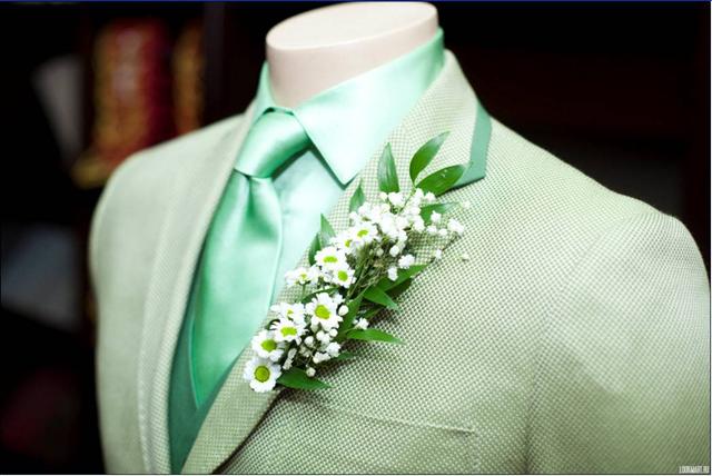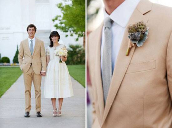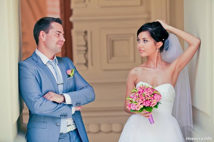 Сочетание цветовой гаммы в нарядах новобрачных это не черно – белый тандем. Идеально, если цвет мужского костюма немного темнее платья невесты. Если платье белоснежное, костюм серый, кремовый, цвета шампань. Важная деталь костюма – галстук, цветовая гамма этого аксессуара подбирается с учетом цвета волос мужчины, его роста и веса. Жених плотной комплекции будет еще крупнее выглядеть в светлом костюме, будет лучше подобрать темный наряд, осветлив его рубашкой и галстуком.