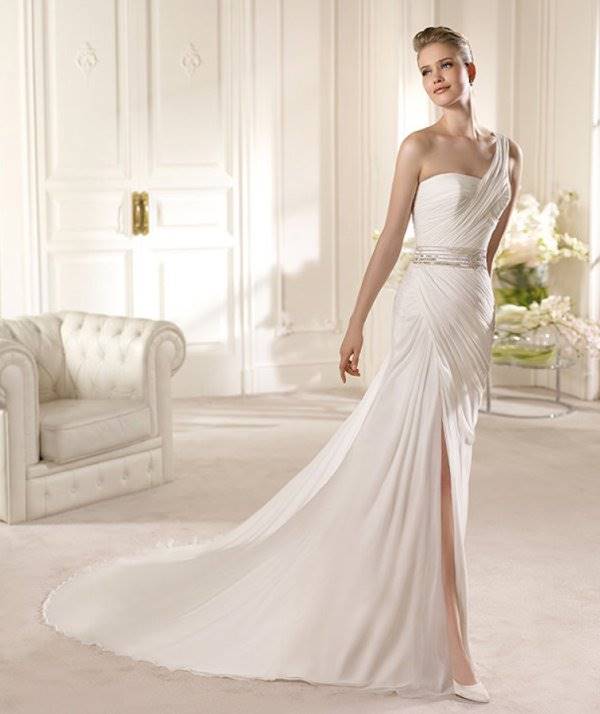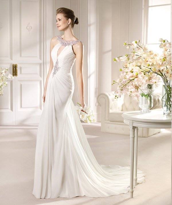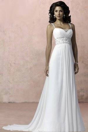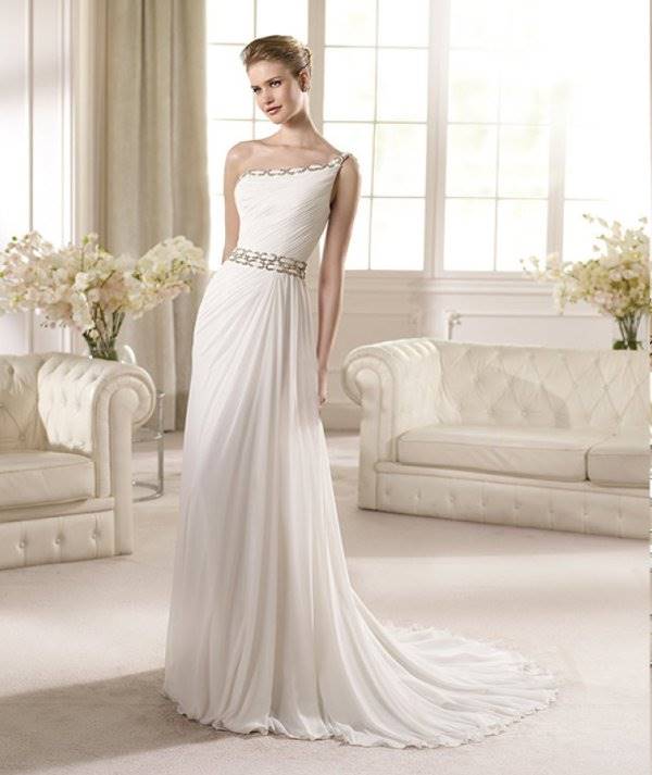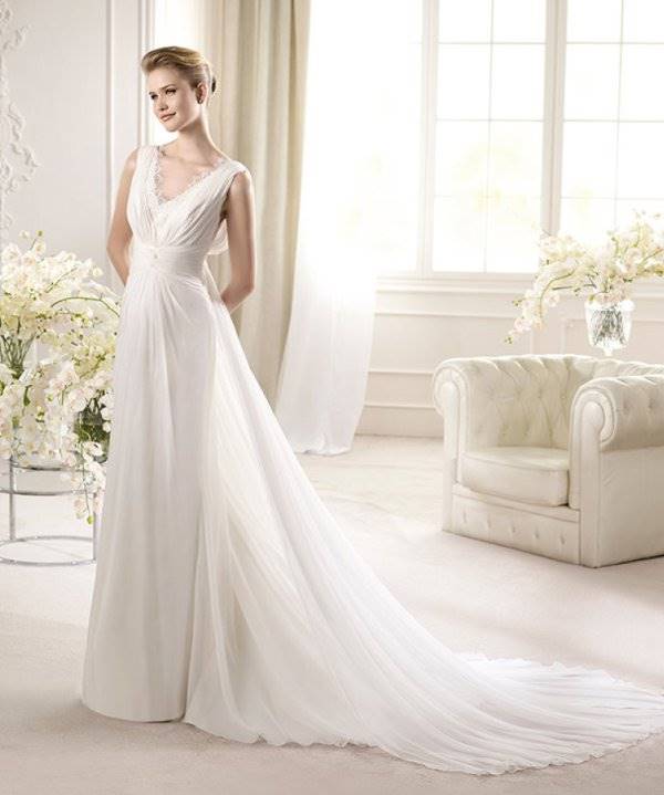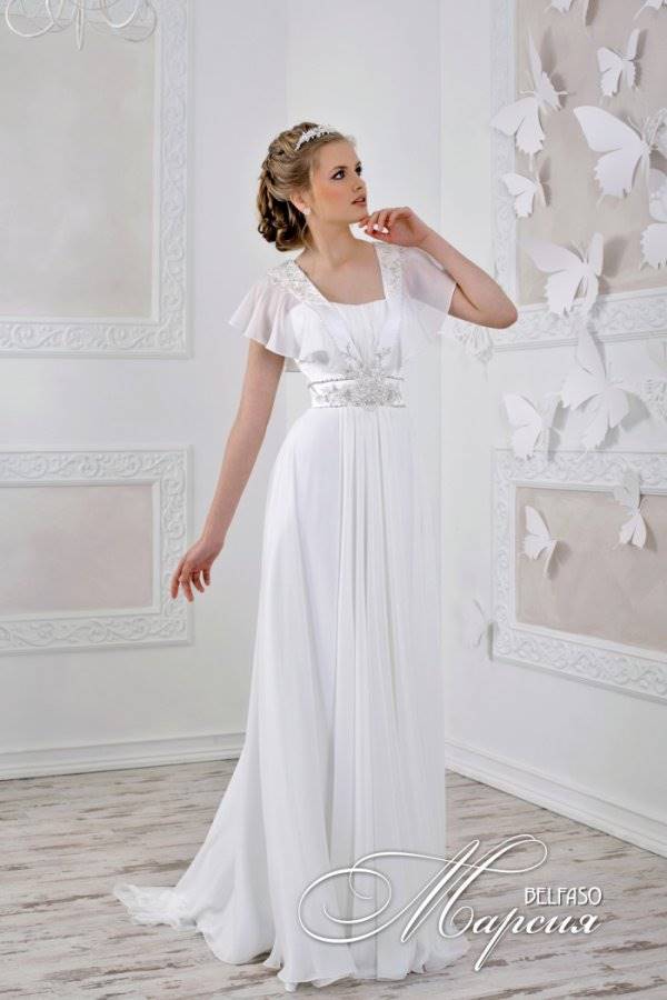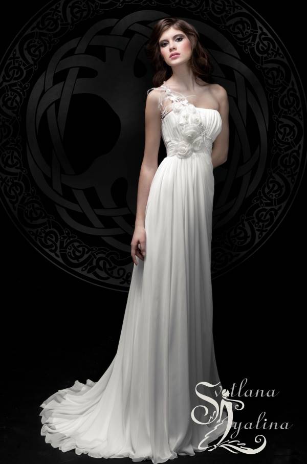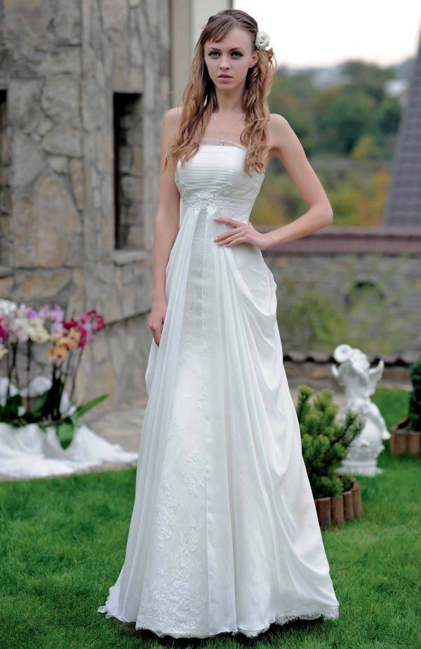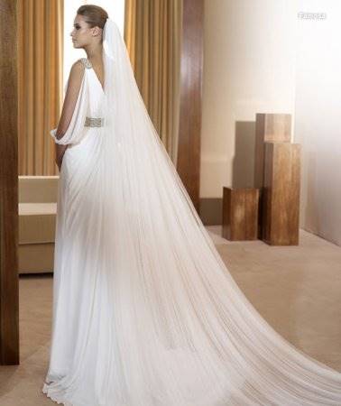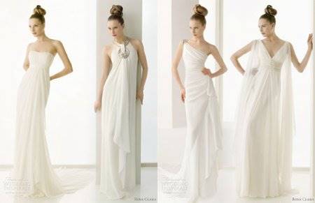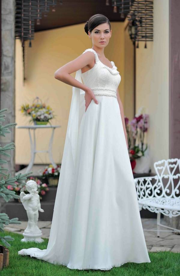Греческие свадебные платья изумительны и необыкновенно нежны. Подобный эффект создан за счет кружево, которое покрывает платье. Струящаяся ткань подчеркивает достоинства фигуры, скрывая недостатки. Обычно, открытыми остаются плечи и руки. Лиф драпируют тонким шифоном. Царственны и величественны платья с длинным шлейфом. А платья – плиссе придают образу особый шик. Бретели на платье могут играть роль украшения, двойные или совсем невидимые плавно выходящие из лифа. Украсит платье изящная шнуровка на спине. На греческих платьях хорошо смотрится серебряный цвет. Например, декор лифа или бретелей вышивкой и серебристыми фестонами, обувь и бижутерия с элементами серебра. Вполне допустимо и золото. Важно, не перегрузить платье украшениями, стиль предполагает элегантность и утонченность.